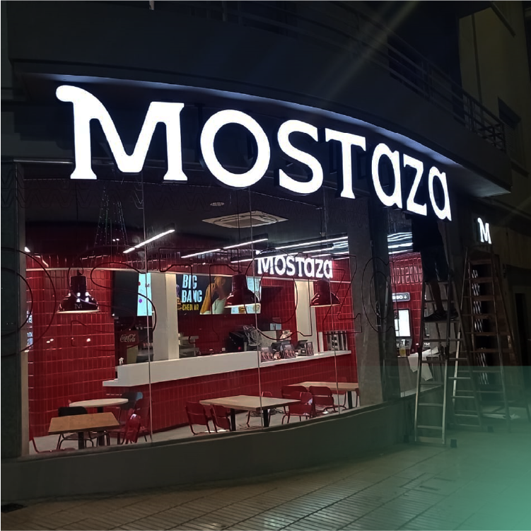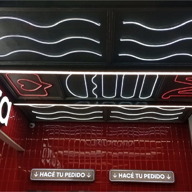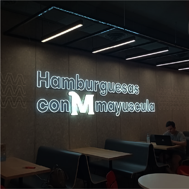 Fabricación e instalación de carteles corporeos y decoración intervenída con Neon LED para la sucursal Mostaza Plaza España